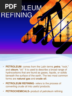 Generally blackish in color, crude oil has a characteristic odour that comes from the presence of small quantities of chemical compounds containing sulphur and nitrogen. Where our oil comes from. We connect ready buyers or agents with refineries and assist in every. Petroleum refining processes are the chemical engineering processes and other facilities used in petroleum refineries (also referred to as oil refineries) to transform crude oil into useful products such as liquefied petroleum gas (lpg), gasoline or petrol, kerosene, jet fuel, diesel oil and fuel oils. The simplest of the hydrocarbon molecules is methane (ch4), which has one most of the paraffin compounds in naturally occurring crude oils are normal paraffins.
